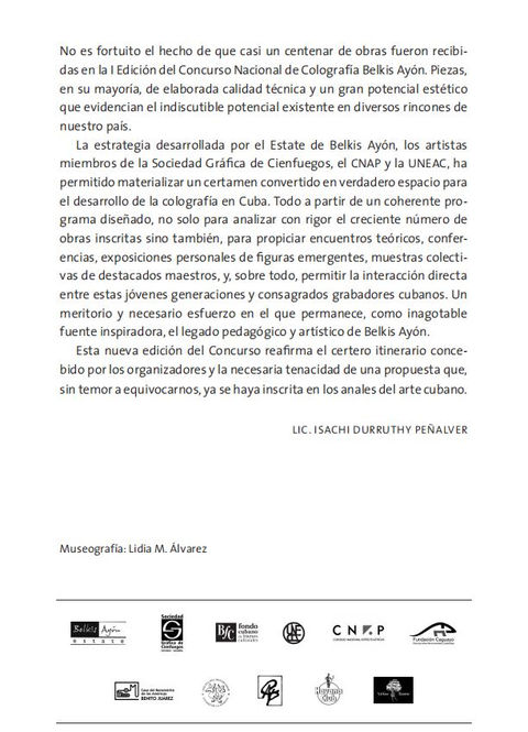 A single and indivisible Grand Prize will be awarded consisting of 3 000.00 MN (donation of the artists belonging to the Taller de la Sociedad Gráfica de Cienfuegos and the Estate of Belkis Ayón), a diploma and a reproduction of a work by the artist to which the contest is dedicated.