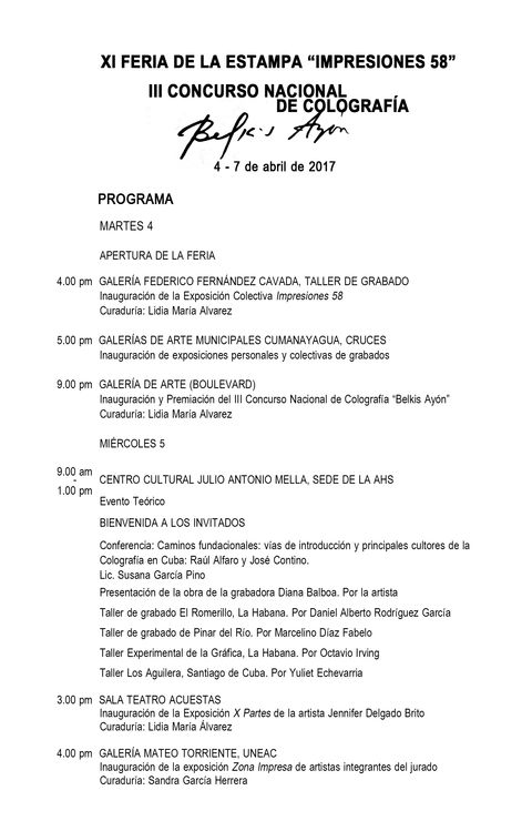 A single Jury will be appointed to select and award the works received. The selected and awarded works will be exhibited in the Cienfuegos Art Gallery, within the program of the 9th La Estampa Fair, an event that will be inaugurated on April 7, 2015, at 9 p.m., at which time it will be officially the jury's decision. The exhibition will remain open to the public for 30 days. Likewise, it will be presented at the Casa del Benemérito de las Américas Benito Juárez of the Office of the City Historian, Havana, in 2015.